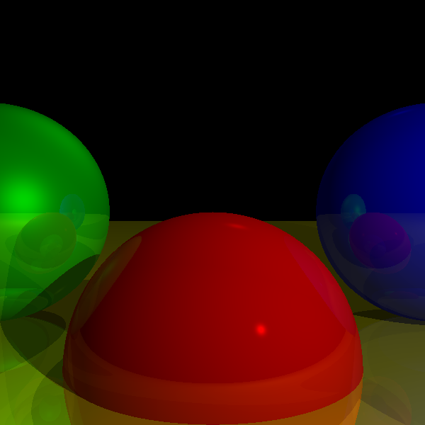 So to simplify things, I removed reflection and focused only on pure transparency once the refraction formula was done. Then I started adding materialβs own color to the transparency and checking if semi-transparency works fine. And in order to blend colors, we first need to normalize them to avoid oversaturation, and then blend together reflection color + refraction color + local objectβs color as a good old weighted average of those colors.